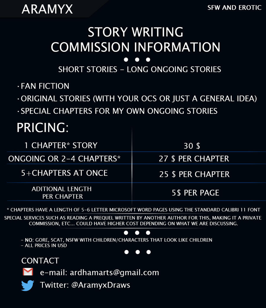 All the information pertinent to commissions such as prices, features, conditions etc... can be found in the first two images.